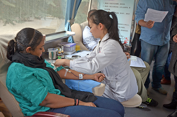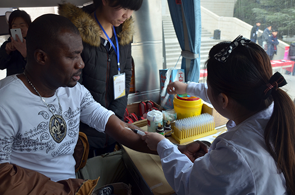 2015年12月5日上午九点,外国留学生志愿献血活动在西北师大中心广场举行。这是甘肃高校首次组织外国留学生进行献血志愿活动。活动由甘肃省血液中心,MG冰球突破官网网站(新闻学院)青年志愿者协会联合主办。甘肃省无偿献血志愿者服务队参与活动。MG冰球突破官网网站(新闻学院)党委副书记、副院长王德祥,甘肃省血液中心血源招募科科长王水姗,甘肃省血液中心宣传科科长陶明翠,甘肃省血液中心质量管理科科长唐朝晖,甘肃省血液中心输血研究所所长马爱萍,甘肃省血液中心招募科副科长龚娱霄参加本次活动。