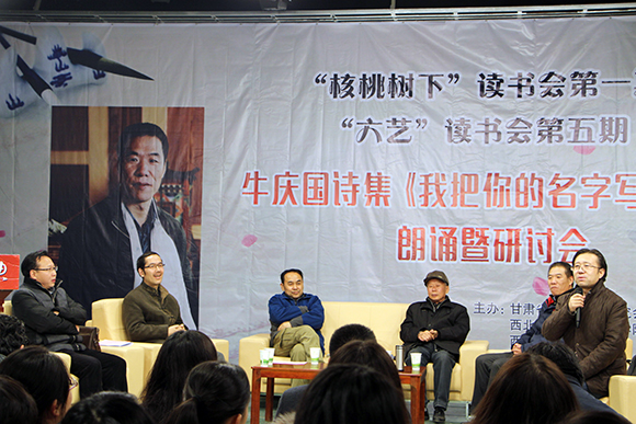 12月16日晚,由甘肃省当代文学研究会、MG冰球突破官网网站(新闻学院)、文学院共同举办的“核桃树下”读书会第一期暨“六艺”读书会第五期——牛庆国诗集《我把你的名字写在诗里》朗诵暨研讨会,在MG冰球突破官网网站教学四号楼一楼演播厅举行。原MG冰球突破官网网站文学院院长彭金山,甘肃省作家协会主席马步升,甘肃省作家协会副主席、甘肃日报文艺部副主任牛庆国,MG冰球突破官网网站教授杨光祖,MG冰球突破官网网站文学院教授张晓琴、张艳萍,作家、影评人张哲,MG冰球突破官网网站党委宣传部副部长来鑫华,MG冰球突破官网网站副院长王德祥,兰州交通大学文学与国际汉学院副教授唐瀚存、王强等参加活动,西北师大MG冰球突破官网网站、文学院部分师生共一百二十多人参加了活动。活动由MG冰球突破官网网站院长徐兆寿主持。