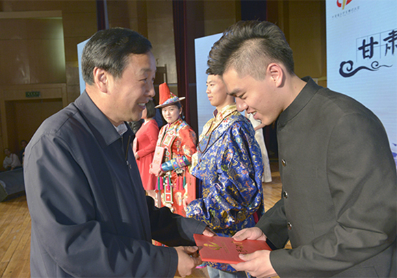 (甘肃省副省长、省语委主任郝远为获得一等奖的选手颁发荣誉证书)