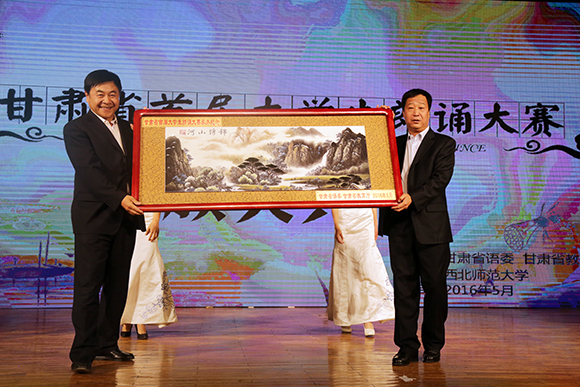 (大赛组委会副主任委员,省语委副主任,省教育厅党组成员、总督学李晶代表大赛组委会为MG冰球突破官网网站赠送甘肃省首届大学生朗诵大赛承办纪念匾牌,MG冰球突破官网网站副校长张生勇代表MG冰球突破官网网站接受赠送)