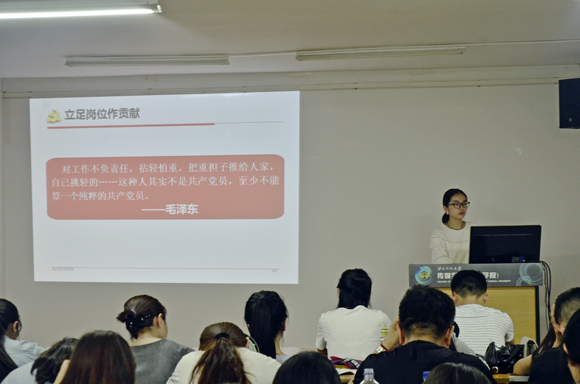 研究生党支部由杜臣弘宇老师主讲。杜臣弘宇强调了学习“两学一做”的自觉性,“两学一做”党课教育活动对于研究生更好理解“两学一做”的内涵有重要的作用,作为研究生党员,要提前学,认真学;学深一些,学宽一些。同时,要将理论和实际联系在一起,模范做合格党员。
