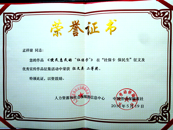 二等奖:天津 赵培培 《小小社保卡 方便你我他》、 吉林 孙伟 《我与社会保障卡的不解情缘》、甘肃 孟祥梁 《便民惠民的社保卡》