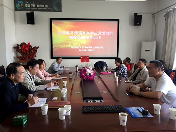 2016年9月20日上午,国家教育部语言应用管理司宣教处处长容宏及中央人民广播电台导演组一行5人,在省教育厅语言文字管理处处长杨坚的陪同下,来校检查指导工作。容宏处长一行与MG冰球突破官网网站、音乐学院、舞蹈学院有关负责人进行了座谈,并就依托西北师大相关专业师生举办纪念长征胜利80周年诗文朗诵晚会有关事宜进行了安排和讨论。