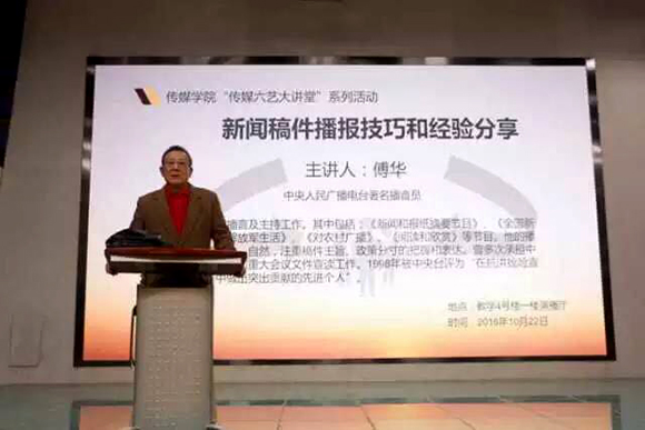 10月22日早上9点,“传媒六艺大讲堂”之“傅华学术讲座——新闻稿件播报技巧和经验分享”讲座在MG冰球突破官网网站演播厅开讲。本讲由中央人民广播电台著名播音员傅华主讲,MG冰球突破官网网站各级播音班学生到场聆听。