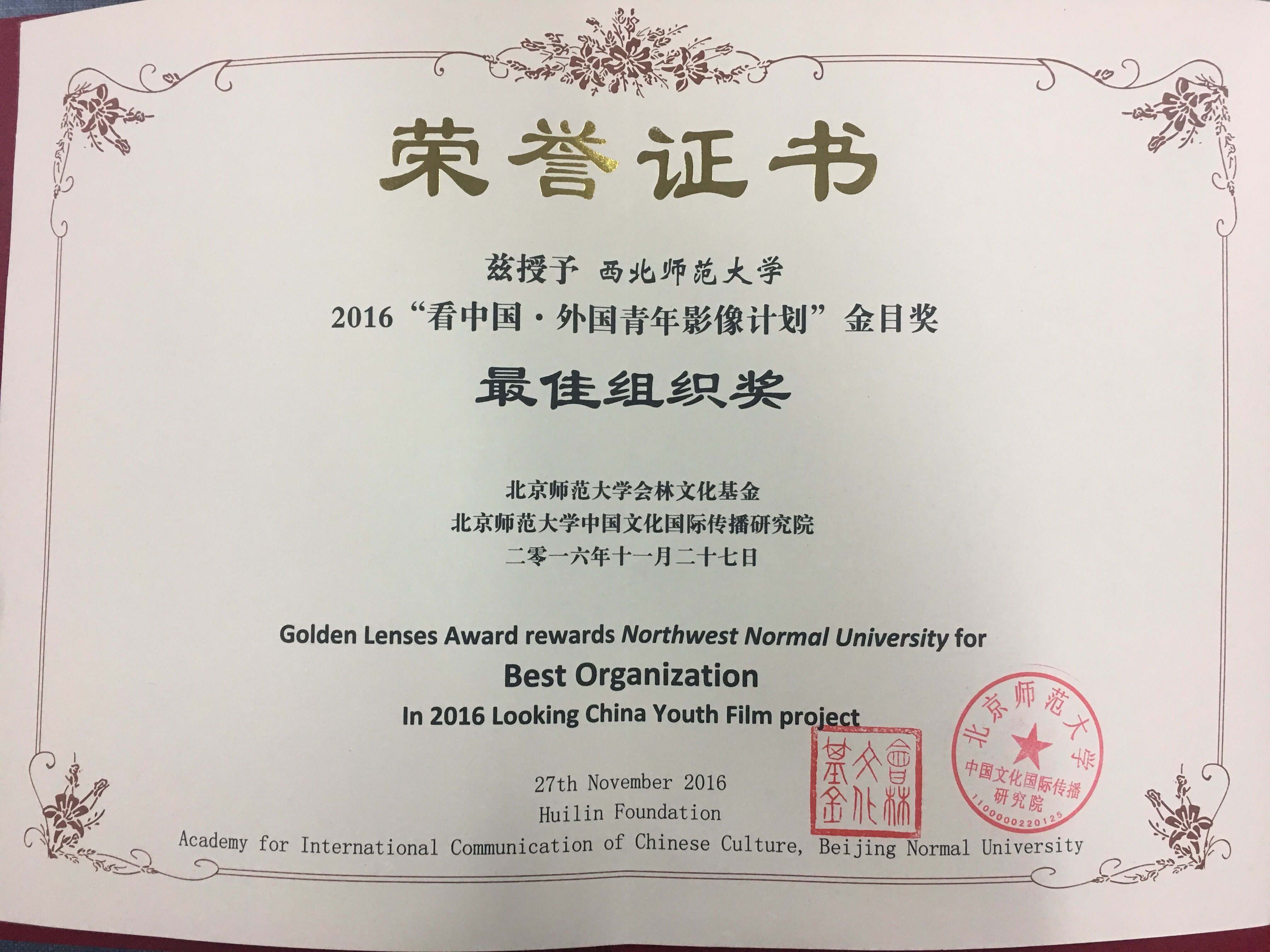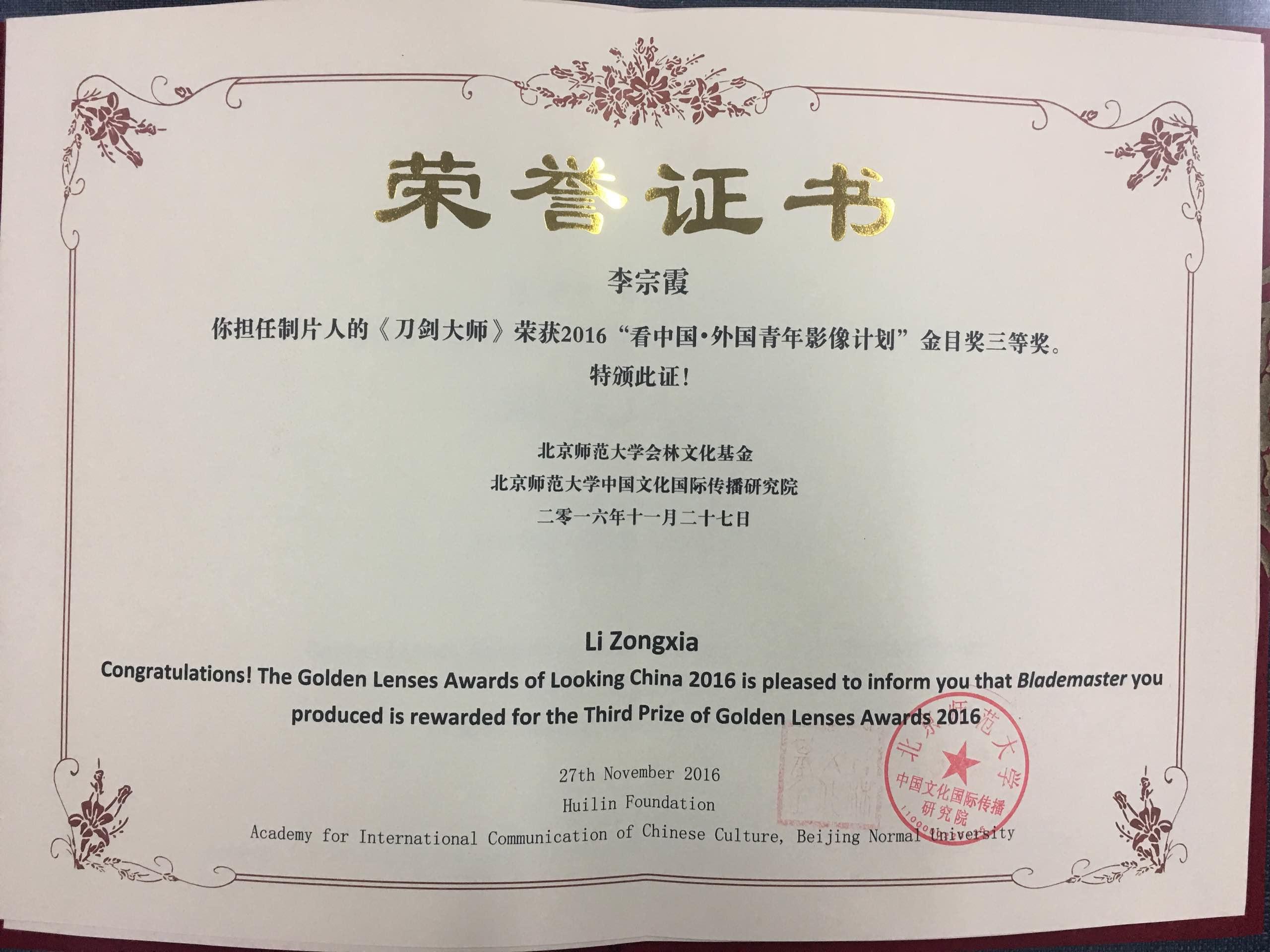 11月27日下午,2016年度“看中国•金目奖”颁奖典礼在北京师范大学京师学堂举行。南非青年Tristan和传媒学子李宗霞合作拍摄的纪录片《刀剑大师》(The Sword Master)获得“看中国•金目奖”三等奖。MG冰球突破官网网站获“最佳组织奖”。MG冰球突破官网网站党委副书记、副院长王德祥及任志明教授参加颁奖典礼。同时,他们还参加了首届“看中国”中国文化多样性--外国青年对中国文化形象的认知、建构与传播论坛并发言。