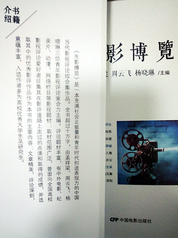 《光影博览》是一本充满社会正能量和青年时代创造表现力的中国当代影视评论综合集作品。全书共十六万字,由冰球官网孟祥梁、北京电影学院周云飞、北京第二外国语学院MTI口译硕士杨晓琳(已毕业)三位青年影视评论家合力主编。评论题材丰富,有中外电影、纪录片、动漫电影、网络栏目等影视题材;取材范围广泛,曾面向全国高校影视评论爱好者征集其在影评道路上走过的点滴和取得的成绩,并选取其中的优秀影评作品作为本书的主要内容;文章精美,评论深刻,意蕴丰富,入选作者多为高校优秀大学生及研究生。