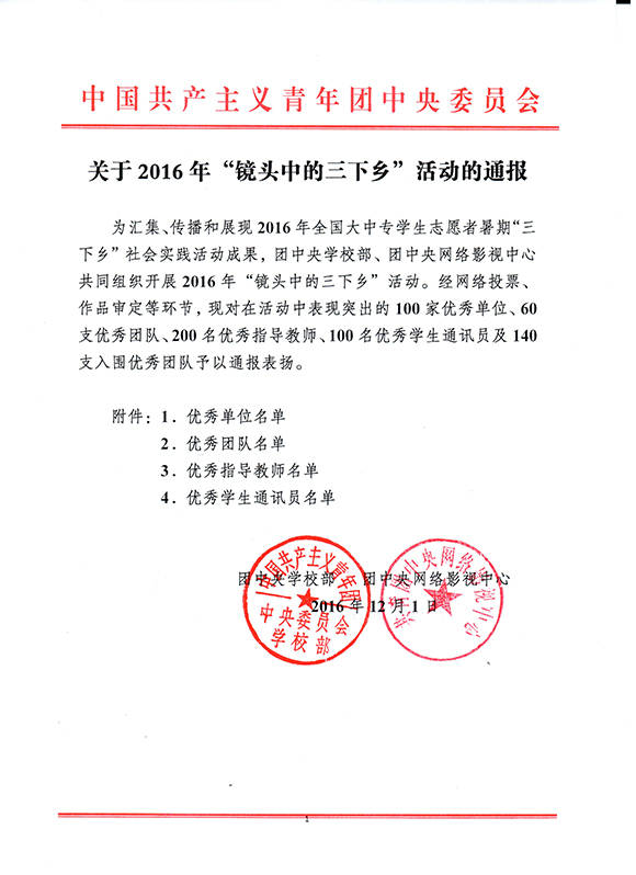 本次活动由团中央学校部、团中央网络影视中心主办,中国青年网、“三下乡”官网承办。MG冰球突破官网网站广角镜社会实践小分队荣获2016年“镜头中的三下乡”入围优秀团队称号。
