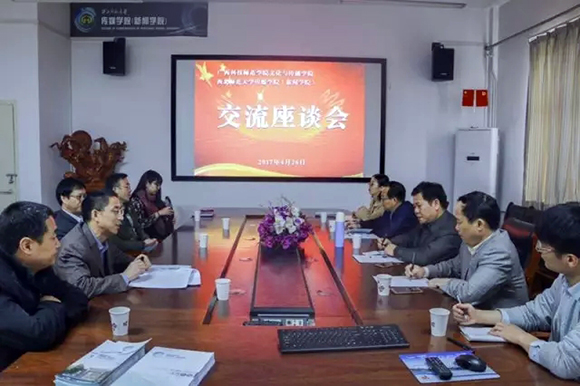 4月26日上午,广西科技师范学院文化与传播学院党总支书记、院长郑盛锦一行5人来学院考察交流。学院党委书记刘永雷,党委副书记、副院长王德祥,新闻系系主任石培龙,实验中心主任张军,本科教务秘书杨凤鸣等参加座谈会。
