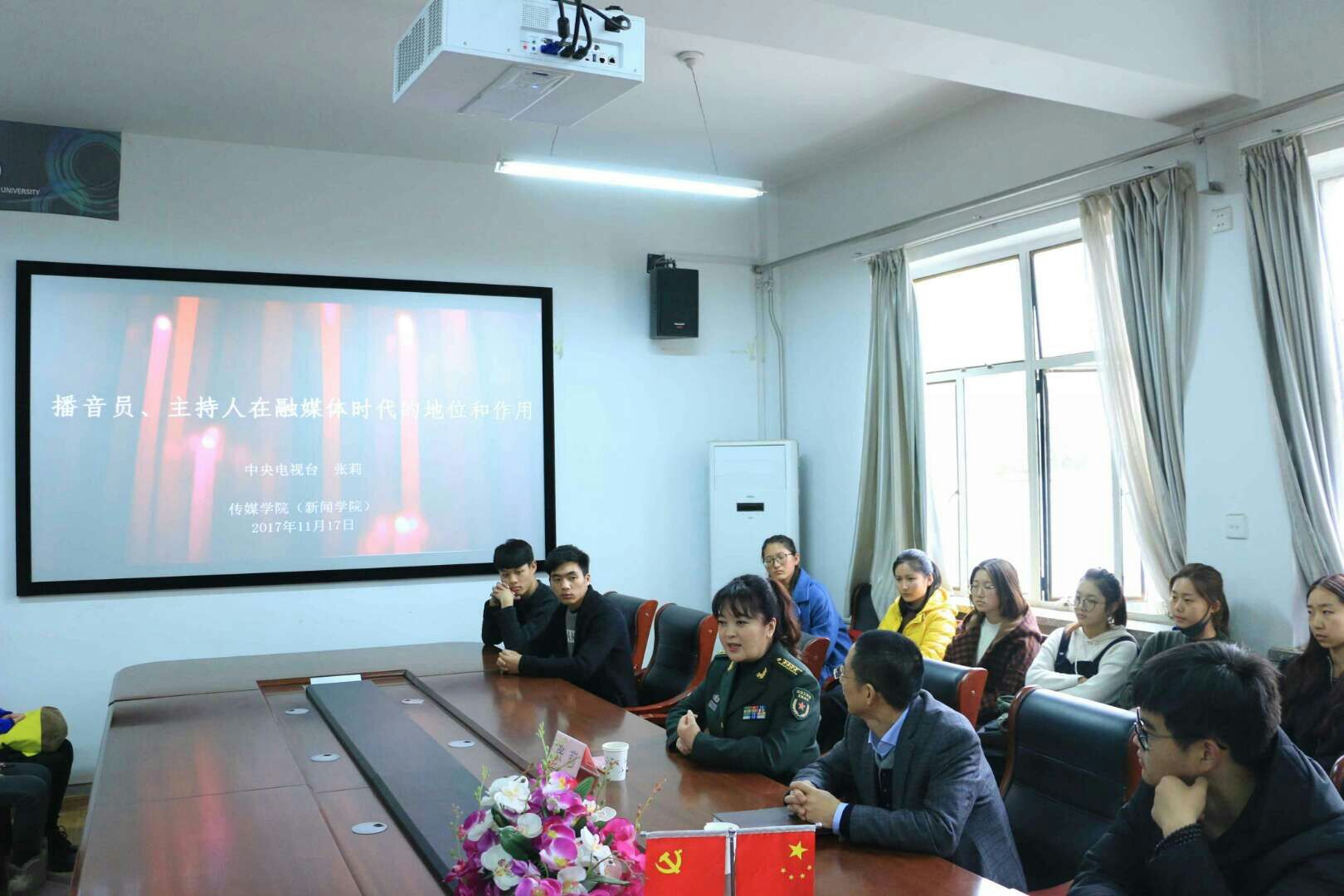 应学院邀请,11月17日下午,中央电视台著名主持人、解放军电视宣传中心新媒体部总编辑(中国军视网总编辑),播音指导张莉老师在MG冰球突破官网网站310举行了以“播音员、主持人在融媒体时代的地位和作用”为主题的报告会,报告会由学院党委副书记、副院长王德祥主持,MG冰球突破官网网站播音与主持艺术专业部分研究生、本科生听取报告。