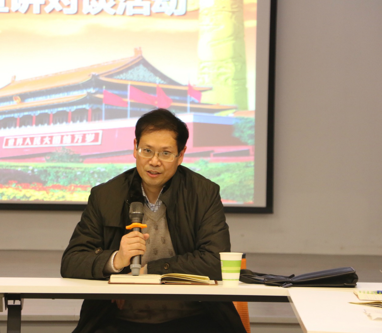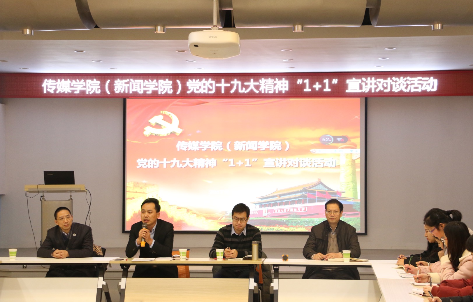 12月13日晚上7点半,MG冰球突破官网网站(新闻学院)于大学生发展中心101开展党的十九大精神“1+1”宣讲对谈活动,校党委委员、党委学生工作部部长李勇,马克思主义学院副教授曹亚斌作为宣讲对谈嘉宾参加,MG冰球突破官网网站(新闻学院)党委书记刘永雷,党委副书记、副院长王德祥,团委书记赵洁以及学院全体学生党员、入党积极分子及部分学生干部的参加了活动。