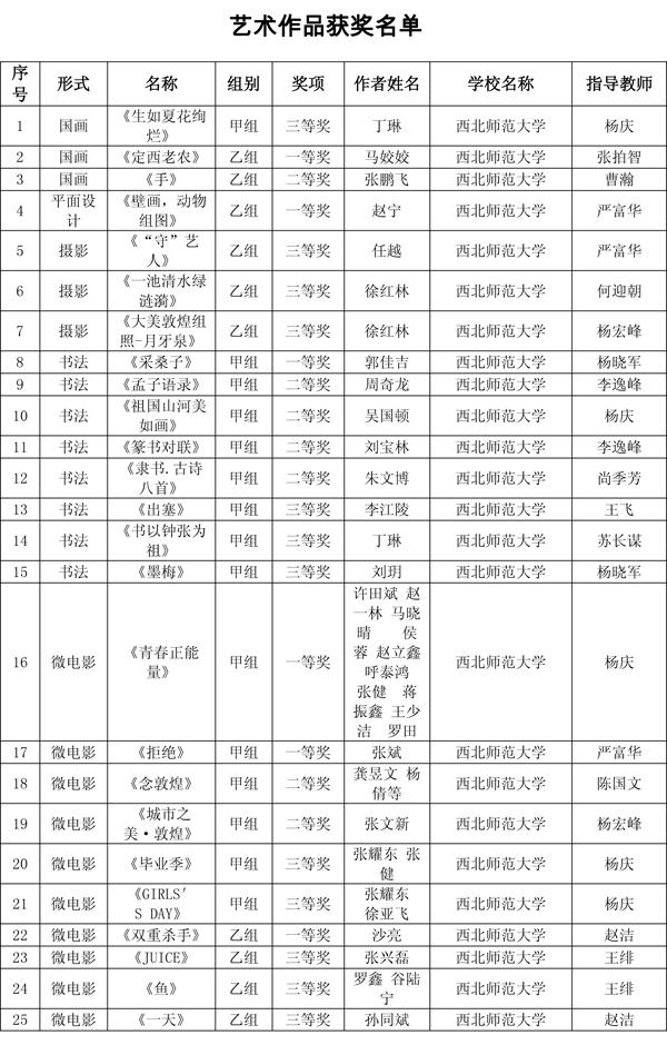 近日,甘肃省第五届大学生艺术展演举行。其中,传媒学子参加的艺术表演类朗诵节目《少年中国说》获乙组三等奖,《惊沙》获甲组三等奖,14级动画班(敦煌学院)赵宁的平面设计《壁画,动物组图》获乙组一等奖,16级广播电视二班赵一林和15级新闻班马晓晴参与摄制的微电影《青春正能量》获甲组一等奖,13级广播电视二班张耀东参与摄制的微电影《毕业季》和《GIRL’S DAY》均获甲组三等奖,13级广播电视二班沙亮的微电影《双重杀手》获乙组一等奖,13级广播电视二班张兴磊的微电影《JUICE》获乙组三等奖,13级动画班罗鑫和谷陆宁的微电影《鱼》获乙组三等奖,13级广播电视一班孙同斌的微电影《一天》获乙组三等奖。