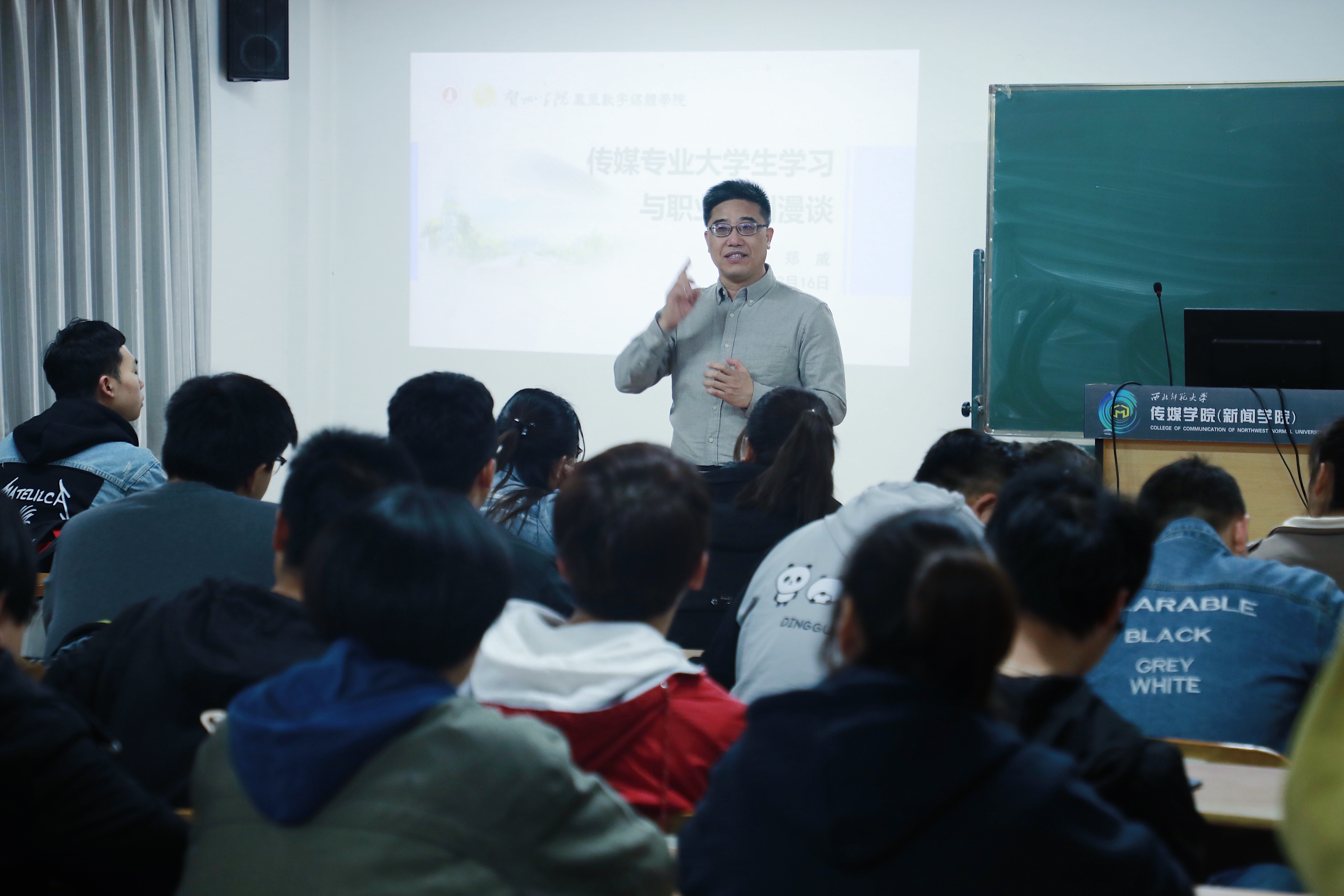 接下来,郑院长围绕三个问题:传媒专业要什么?传媒专业学什么?我们需要做什么?展开了讨论。郑院长还给同学们举例说明了实习期时应该如何进行规划,也鼓励学生创业,学会营销,培养市场意识,投身到实践中去。