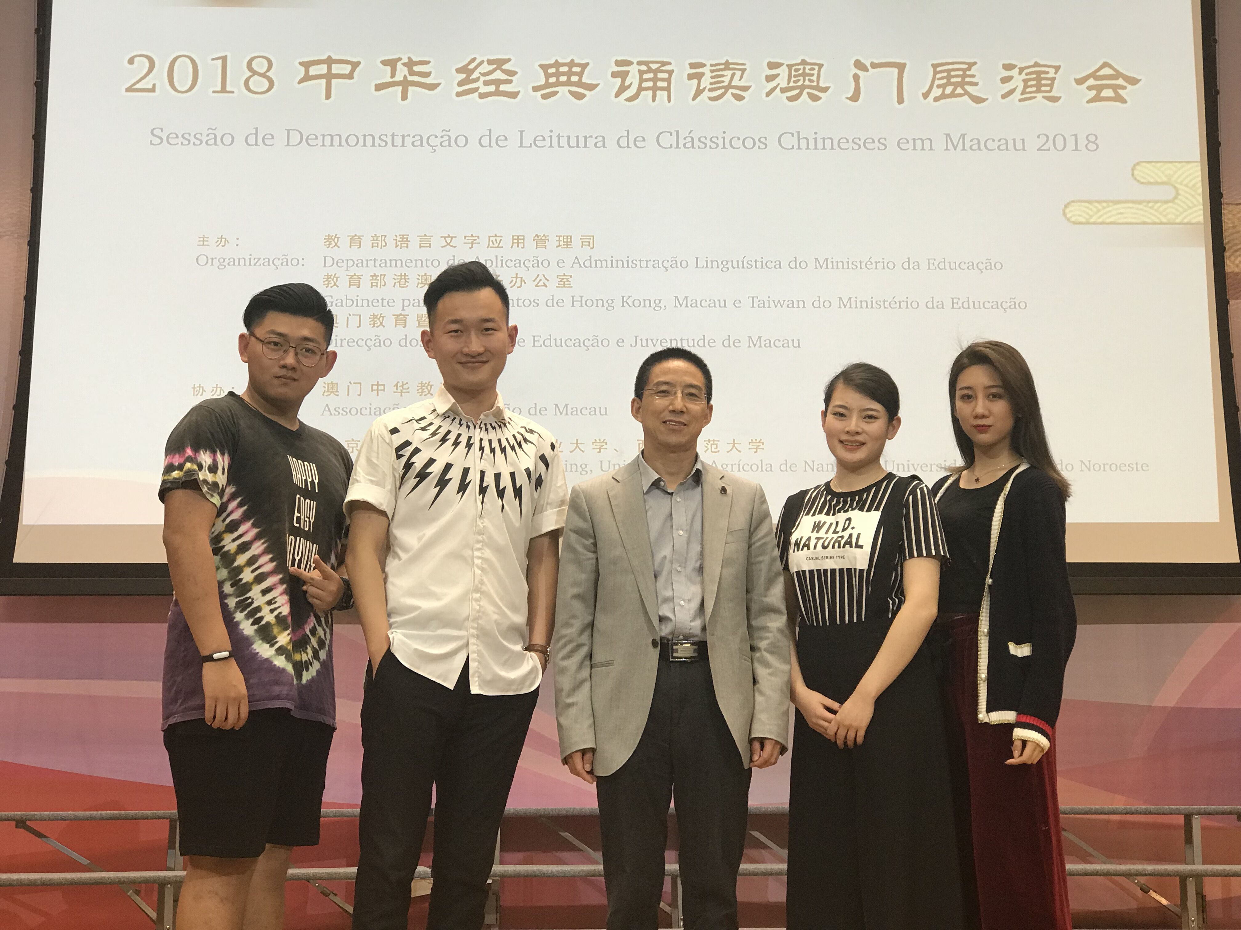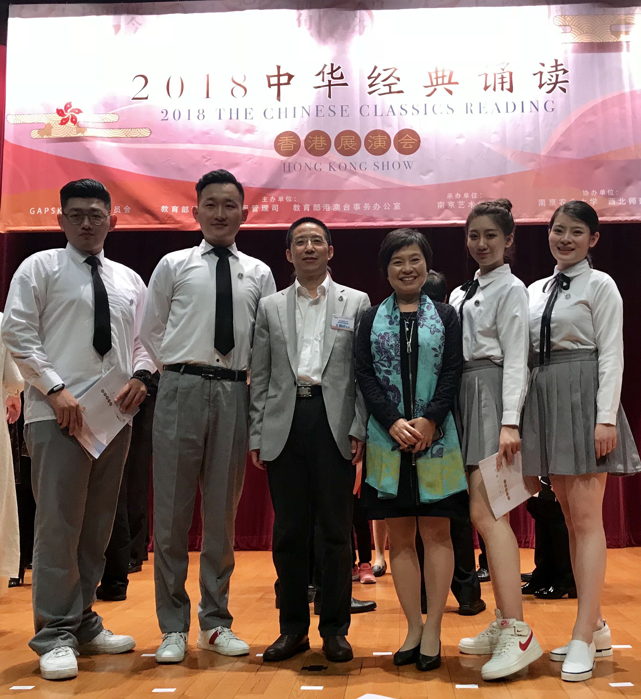 4月13日-19日,MG冰球突破官网网站党委副书记、副院长王德祥带领2015级播音与主持艺术班学生李欣锐、王强、许峥,2016级播音与主持艺术班学生王乐天等4名学生参加了由教育部语言文字应用管理司、港澳台事务办公室主办的2018年中华经典诵读港澳展演交流活动。