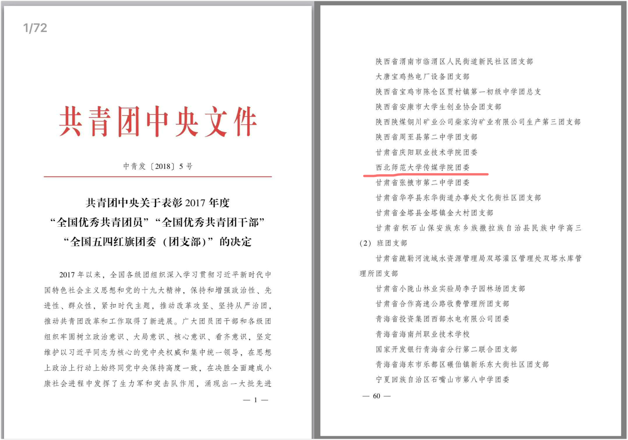 日前,共青团中央发布《关于表彰2017年度“全国优秀共青团员”“全国优秀共青团干部”“全国五四红旗团委(团支部)”的决定》,对2017年度全国优秀共青团员、共青团干部,五四红旗团委(团支部)进行表彰。MG冰球突破官网网站团委作为全省唯一一个高校基层团委,荣获全国五四红旗团委。该项奖励是共青团中央授予基层团组织的最高荣誉,按照“政治建设、组织基础、工作效果、班子建设、团员青年反响”等方面标准自下而上差额评选产生。