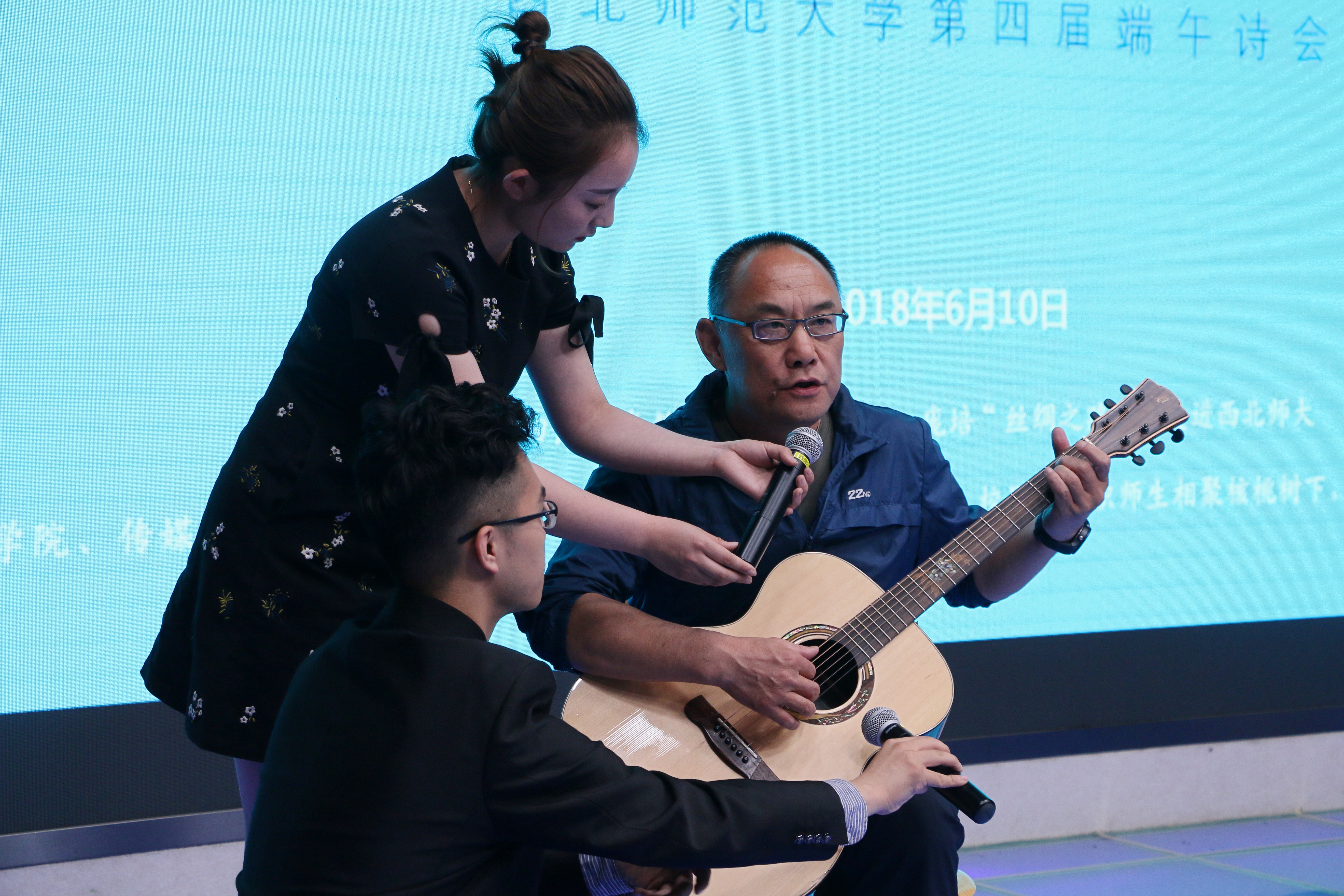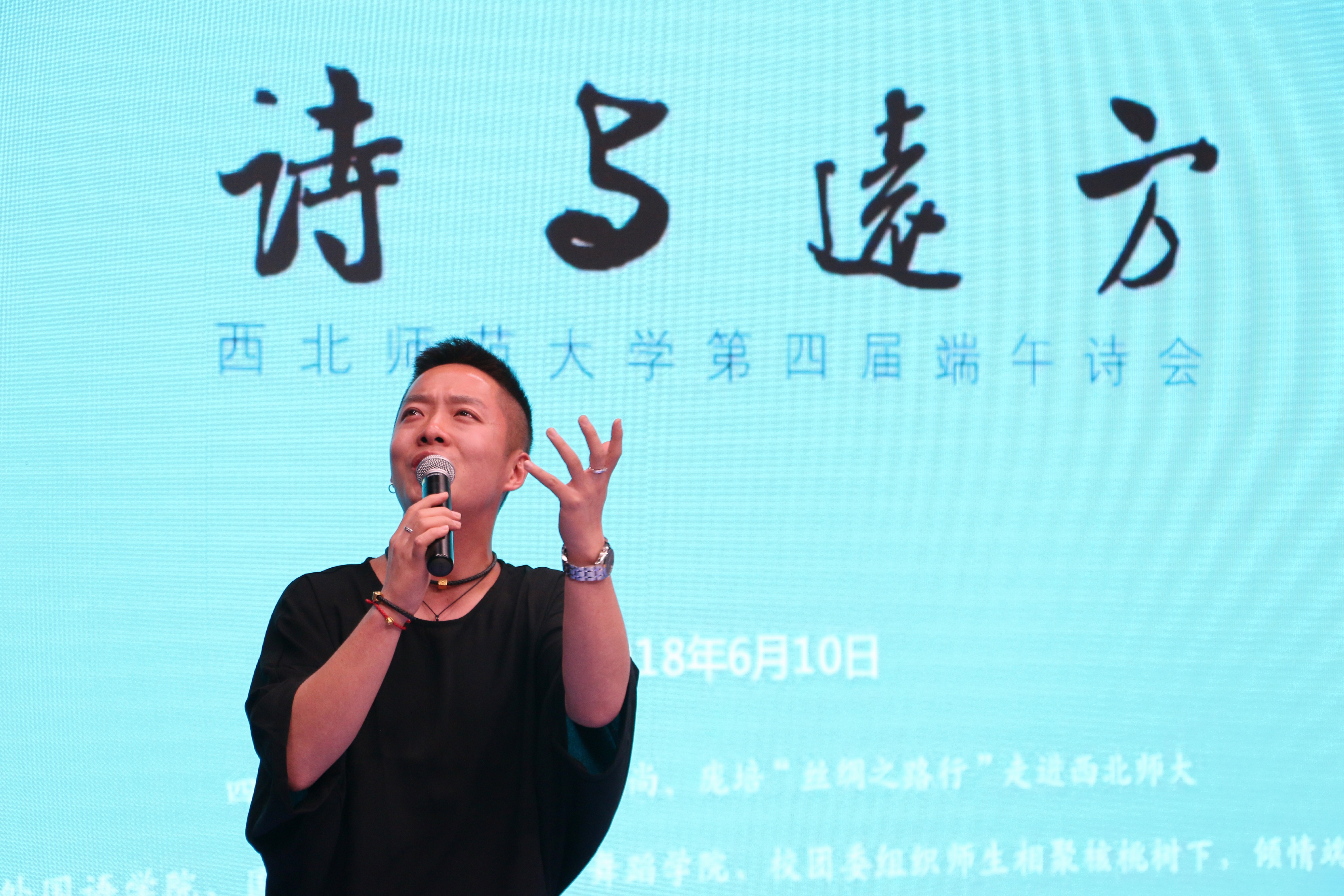 学校党委书记张俊宗和邓小娟、曹进、徐兆寿、韩高年四位院长声情并茂的朗诵将诗会氛围推向高潮。四位诗人和甘肃省著名朗诵艺术家临溪也为同学们即兴进行了朗诵。