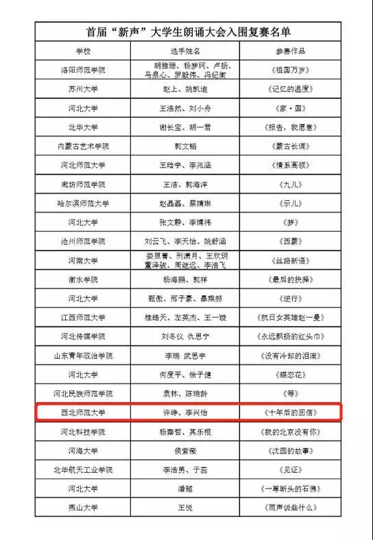 7月31日,首届“新声”大学生语言文化艺术节主竞赛单元——朗诵大会复赛入围名单新鲜出炉,MG冰球突破官网网站2015级播音与主持艺术班许峥与2016级播音与主持艺术班李兴怡入围此次朗诵大会复赛,参赛作品为《十年后的回信》。