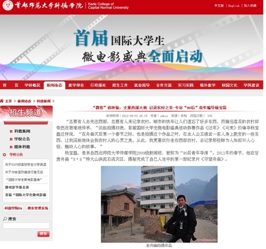 9月3日,冰球官网新闻系2009级学生杨宝磊接受了“首届国际大学生微电影盛典”组委会的电话专访,这也是西北地区唯一受访的学生导演。这源于他选送的两部片子《过年》和《刈麦》受到组委会及评委的认可。这两部片子是由冰球官网教师孟子为、陈积银指导学生经过两年的时间,在甘肃舟曲、通渭等地摄制的纪录片。