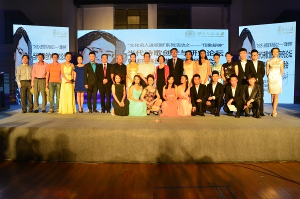 6月25日晚,由MG冰球突破官网网站党委宣传部、MG冰球突破官网网站主办,文学院、舞蹈学院、学生工作部、社科处、团委协办、甘肃电视台公共频道支持的“印象舒婷”当代诗歌创作与研究高端论坛暨舒婷经典诗歌朗诵会在MG冰球突破官网网站体育馆隆重举行。中国作家协会主席团委员、福建省文联副主席、厦门市文联主席、第十二届全国人大代表舒婷、著名文学理论家、厦门职大中文系教授陈仲义、北京大学文学博士、中国社会科学院教师、青年批评家陈思、甘肃省著名播音员、朗诵艺术家边城、甘肃省著名播音员、主持人黄睿、我校党委书记刘基、校长刘仲奎、党委常委、副校长刘玉泉、丁虎生和省委宣传部、省教育厅等相关部门负责人出席活动。MG冰球突破官网网站师生、省内外新闻媒体的朋友聆听了朗诵会。
