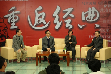 在互动环节,MG冰球突破官网网站院长徐兆寿、副教授任志明以及教育学院副教授安富海与王鉴教授对《学记》中的教育思想做以交流。徐兆寿院长以孔子“朝闻道,夕死可矣”向学生们说明《学记》里蕴含的深厚意义,并建议学生学习《学记》中的经典理论,与老师多沟通交流,学习其“道”。任志明副教授在谈及自己的感受时提到,以学生为职业的人更应该对教育进行积极的探索和思考,此次解读为学生打开了学习的思路。王鉴教授将《学记》与四书相互联系,与《师说》前后呼应,学生要能够在这个领悟学习的过程中学会今后站在经典的肩膀上去读书,去展开人生的阅历,让视野更加开阔、目光更加高远。现场的同学们以如何实践书中所述教育理念、如何引领教育思维等问题向四位老师提问。四位老师从各自专业出发给同学们提出的问题做出了精彩的解答,得到了同学们的热烈掌声。