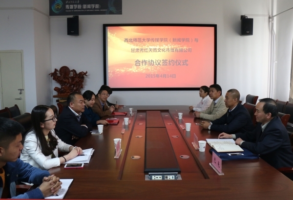 2015年4月14日下午,MG冰球突破官网网站(新闻学院)与甘肃秀红天雨文化传媒有限公司签订合作协议。省委宣传部宣传处处长王国强、副处长王跃涛,甘肃汇源投资有限公司董事长、总裁林建立,甘肃秀红天雨文化传媒有限公司董事长符秀红,甘肃省广电总台新闻综合广播广告运营中心主任张智华,MG冰球突破官网网站党委书记符得团,党委副书记、副院长等参加了签约仪式。签约仪式由符得团主持。王德祥与符秀红代表双方签订了合作协议。王国强、林建立分别致辞。