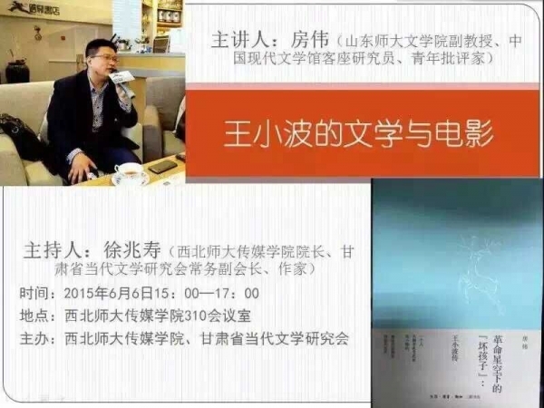 6月6日下午,山东师大文学院房伟副教授在冰球官网310会议室作了题为“王小波:革命星空下的”‘坏孩子’”的报告。报告由副院长杨华主持,院长徐兆寿,党委副书记、副院长王德祥以及冰球官网四十余名本科生、研究生聆听了报告。我省著名作家弋舟先生应邀参与了讨论。