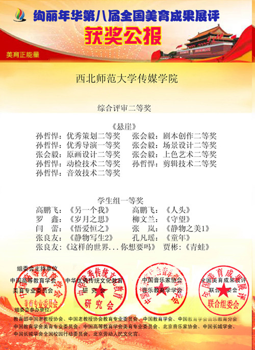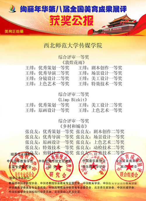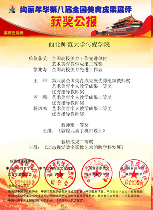 教师组:徐兆寿院长获得“全国高校美育先进工作者”称号;王绯老师、杨凤鸣老师、芦姗老师、分别获得“优秀指导教师奖”;王绯老师获得“艺术美育个人教学成果一等奖;芦姗老师、杨凤鸣老师、老师获得“艺术美育个人教学成果二等奖”。教师组作品一等奖:王绯老师数字媒体艺术设计作品《敦煌元素手机UI设计》;教研成果教研论文二等奖:王绯老师《动态视觉数字影像艺术的跨学科发展》;综合评审动画作品一等奖:王绯老师动画作品《敦煌花雨》;综合评审动画作品二等奖:王绯老师《Limp Bizkit》