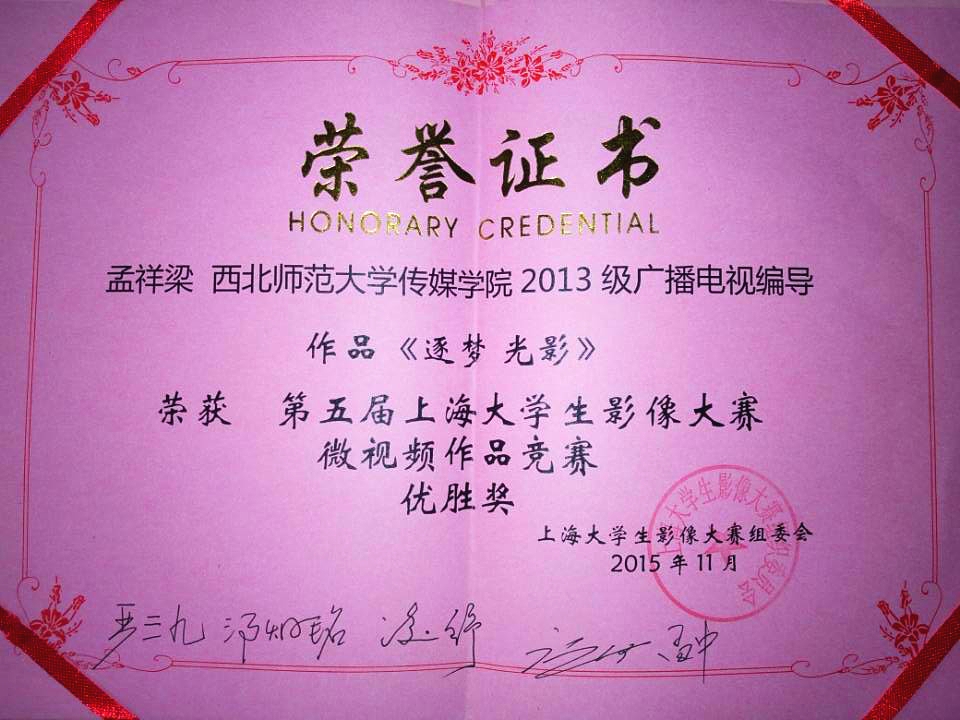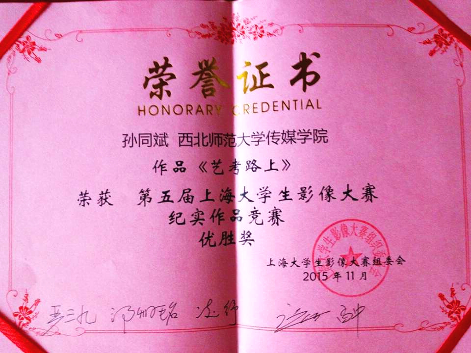 冰球官网广播电视编导专业孟祥梁创作的《逐梦光影》获第五届上海大学生影像大赛微视频作品优胜奖,同专业的孙同斌创作的《艺考路上》获第五届上海大学生影像大赛纪实作品优胜奖。