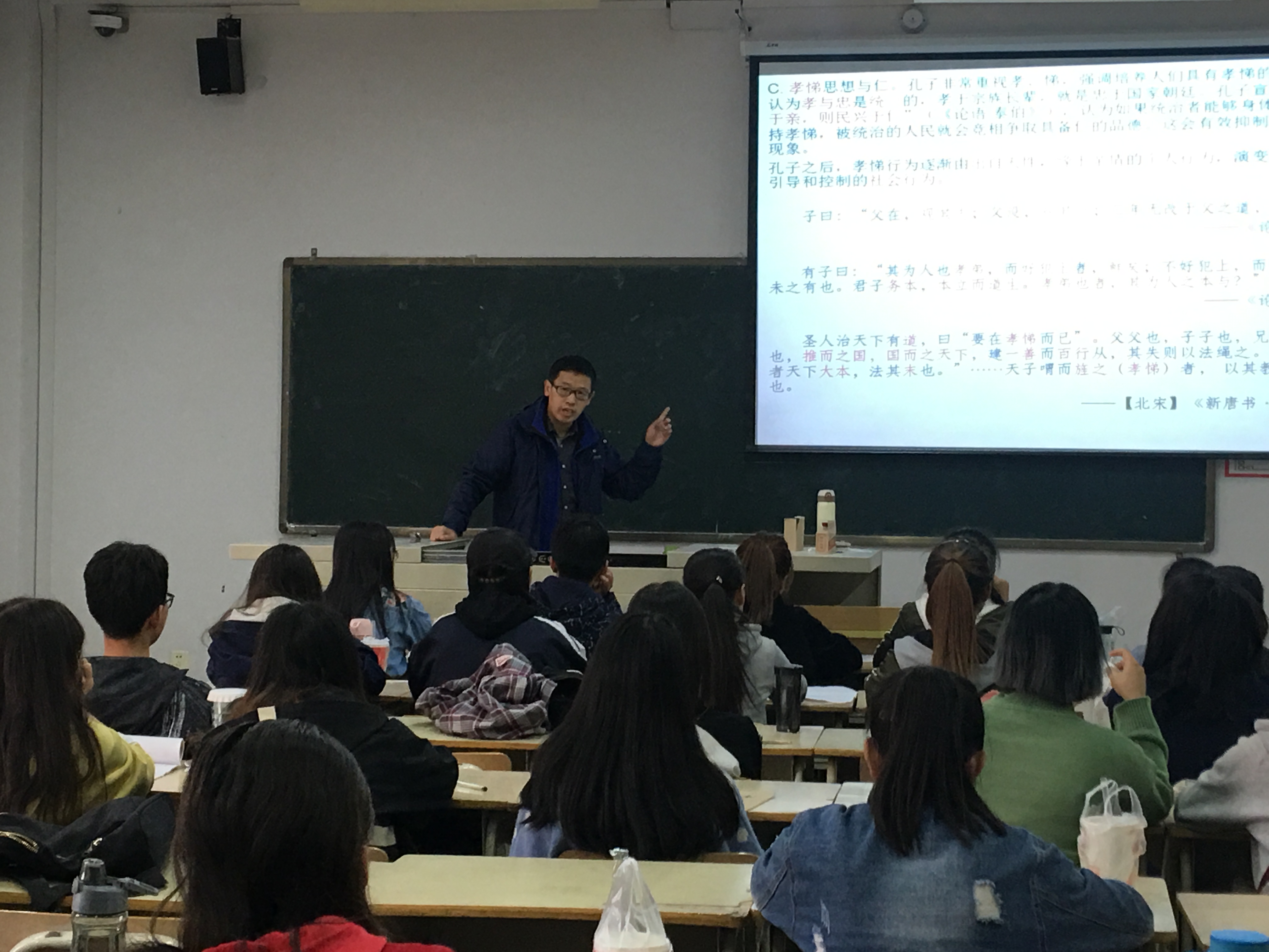 上课过程中,侯老师首先带着大家回顾上节课的知识点“仁的核心思想”和“仁的性质”等,随后讲到“孝悌思想与仁”和“仁的判别标准” 等知识点。在讲授的过程中,侯老师旁征博引,引用大量的文章,以及“二十四孝”的典故,让同学们对“仁”有更为深入的了解。侯老师讲课诙谐幽默、生动有趣,同时整堂课又环节紧凑、重难点突出,充分调动同学们的积极性,降低了学习难度,提高了学习效率。