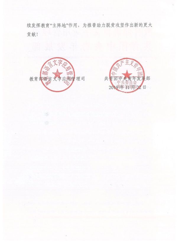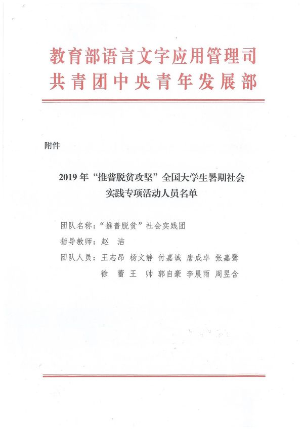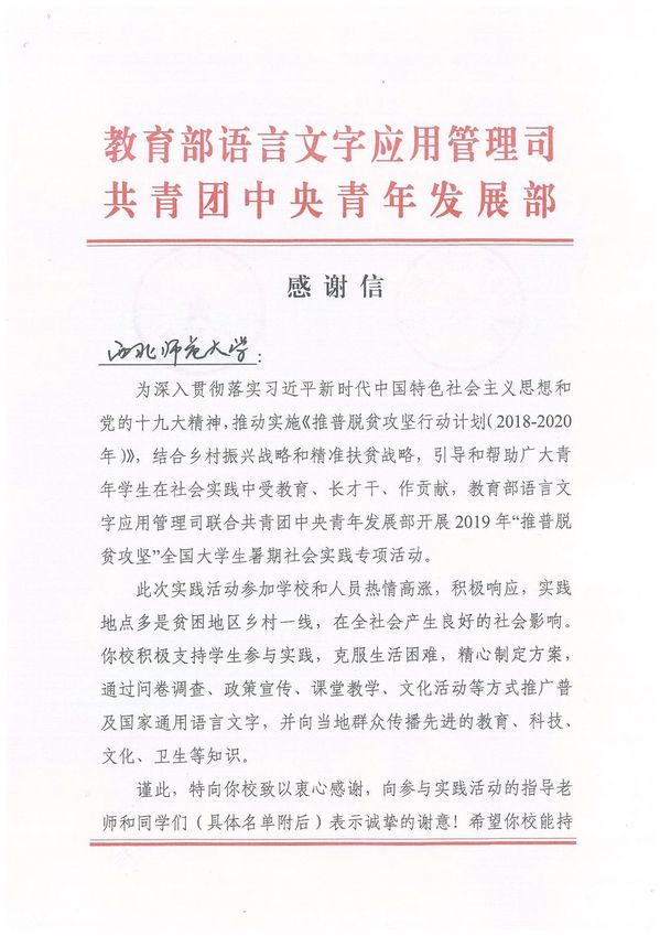 近日,教育部语言文字应用管理司和共青团中央青年发展部致信感谢MG冰球突破官网网站“推普脱贫”社会实践团为助力推普脱贫作出的贡献。