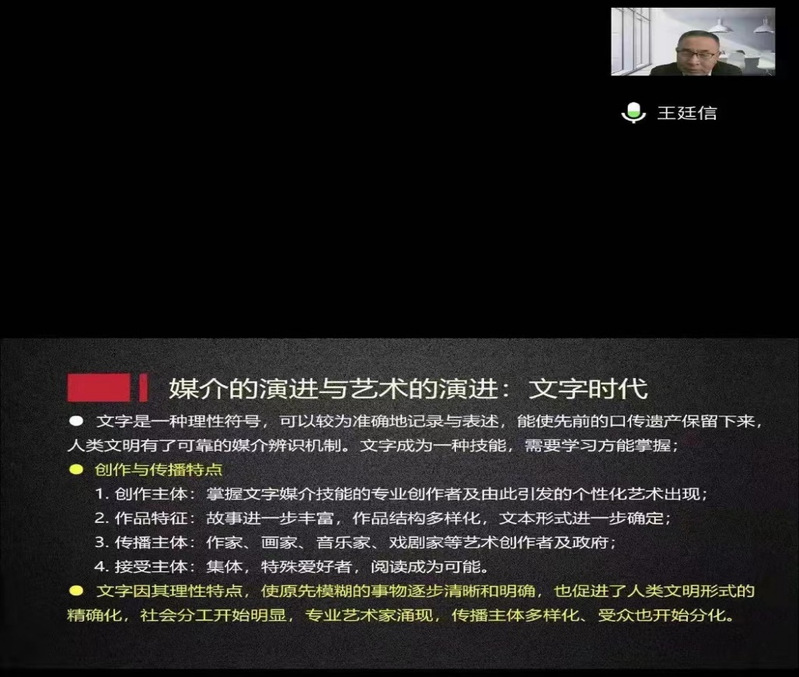 2021年11月30日下午,中国传媒大学艺术研究院教授、博士生导师、常务副院长王廷信教授应邀为冰球官网师生在线开展了题为《艺术行进的轨迹——媒介演进与艺术传播》的学术讲座,讲座由MG冰球突破官网网站芦珊副教授主持,学院近200名师生在线聆听了此次学术讲座。