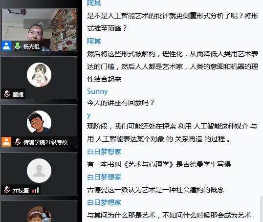 此次讲座由MG冰球突破官网网站杨光祖教授主持。彭锋教授还在线解答了学生们提出的问题,师生就人工智能与艺术这一话题从多方面进行了讨论与交流。