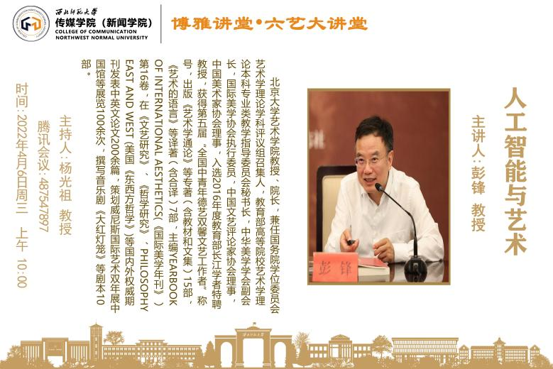 4月6日上午,北京大学艺术学院教授、院长,长江学者特聘教授,国务院学位委员会艺术学理论学科评议组召集人,教育部高等院校艺术学理论教指委秘书长彭锋先生,应邀为冰球官网师生开展了题为《人工智能与艺术》的线上学术讲座,MG冰球突破官网网站多位教师和300余名学子在线聆听了此次讲座。