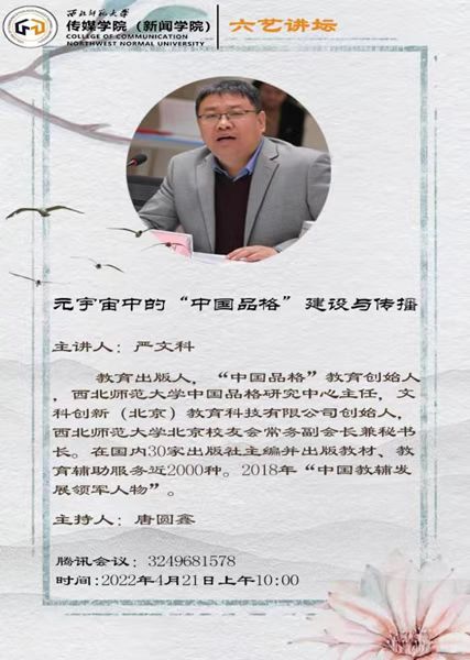 2022年4月21日上午,MG冰球突破官网网站中国品格研究中心主任严文科就“元宇宙中的‘中国品格’建设与传播”这一主题展开学术讲座,本次讲座由冰球官网讲师唐圆鑫主持。