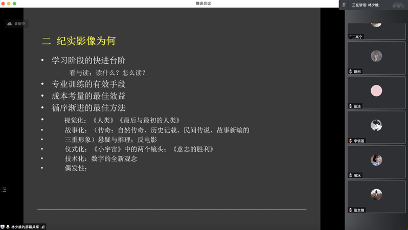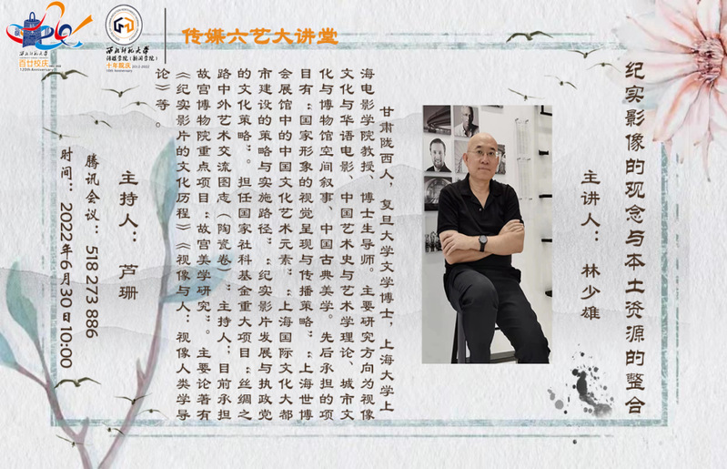 2022年6月30日,应MG冰球突破官网网站邀请,上海大学上海电影学院教授、博士生导师,兰州大学特聘教授林少雄教授作了题为《纪实影像的观念与本土资源的整合》的学术讲座,学院师生40余人参与。本场学术讲座由MG冰球突破官网网站芦珊副教授主持。