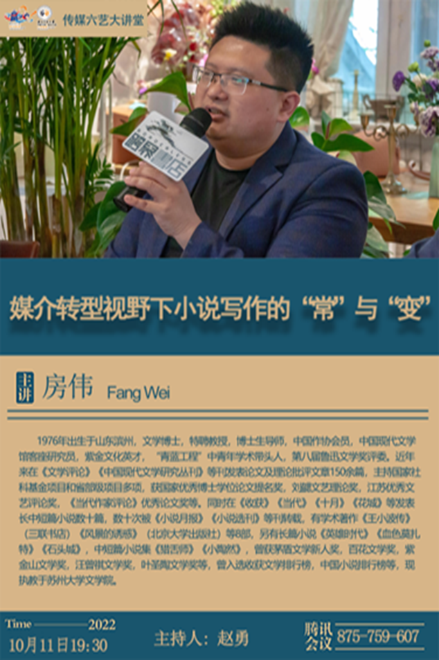 10月13日晚,苏州大学房伟教授为冰球官网师生作了题为《媒介转型视野下小说写作的“常”与“变”》的学术讲座,讲座由MG冰球突破官网网站赵勇老师主持,240余名师生在线聆听了此次讲座。