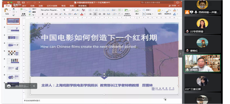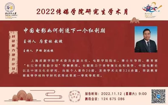 2022年11月12日上午9点,上海戏剧学院学术委员会副主任、电影学院院长、博士生导师、教育部“长江学者奖励计划”特聘教授厉震林应邀为冰球官网师生开展题为《中国电影如何创造下一个红利期》的学术讲座。本次讲座是2022MG冰球突破官网网站研究生“学术月”系列活动“科研能力提升计划”第三讲,MG冰球突破官网网站副院长赵丽瑾教授发表致辞,MG冰球突破官网网站副教授芦珊主持本次讲座,此次线上讲座冰球官网100余位师生参会,在线聆听了厉震林教授的学术分享。