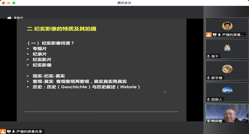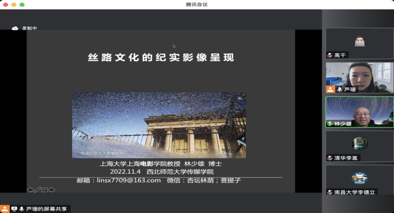2022年11月4日上午,复旦大学文学博士、上海大学电影学院博士生导师林少雄教授应邀为冰球官网师生开展题为《丝路文化的纪实影像呈现》的学术讲座,MG冰球突破官网网站副教授芦珊主持讲座,MG冰球突破官网网站百余名师生在线聆听了林少雄老师的学术分享并互动交流。