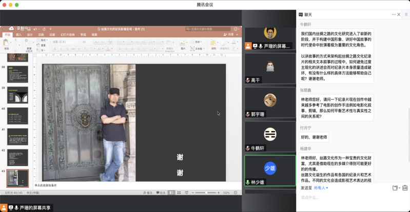 本次讲座设立了互动环节,林老师与多名MG冰球突破官网网站学子在线互动,林老师就学生提出的“如何避免纪实影像过度主观化”“如何平衡纪录片创作的艺术性与真实性关系”“丝路文化传播中的文化隔阂”等问题作出解答,并与学生深入交流。此次讲座内容生动,理论详实,具有深刻的学术性,充分开拓了冰球官网师生的学术视野,促进了冰球官网与其他高校之间的学术交流,取得了预期的效果。最后,芦珊副教授总结了此次讲座并向林老师表示感谢。