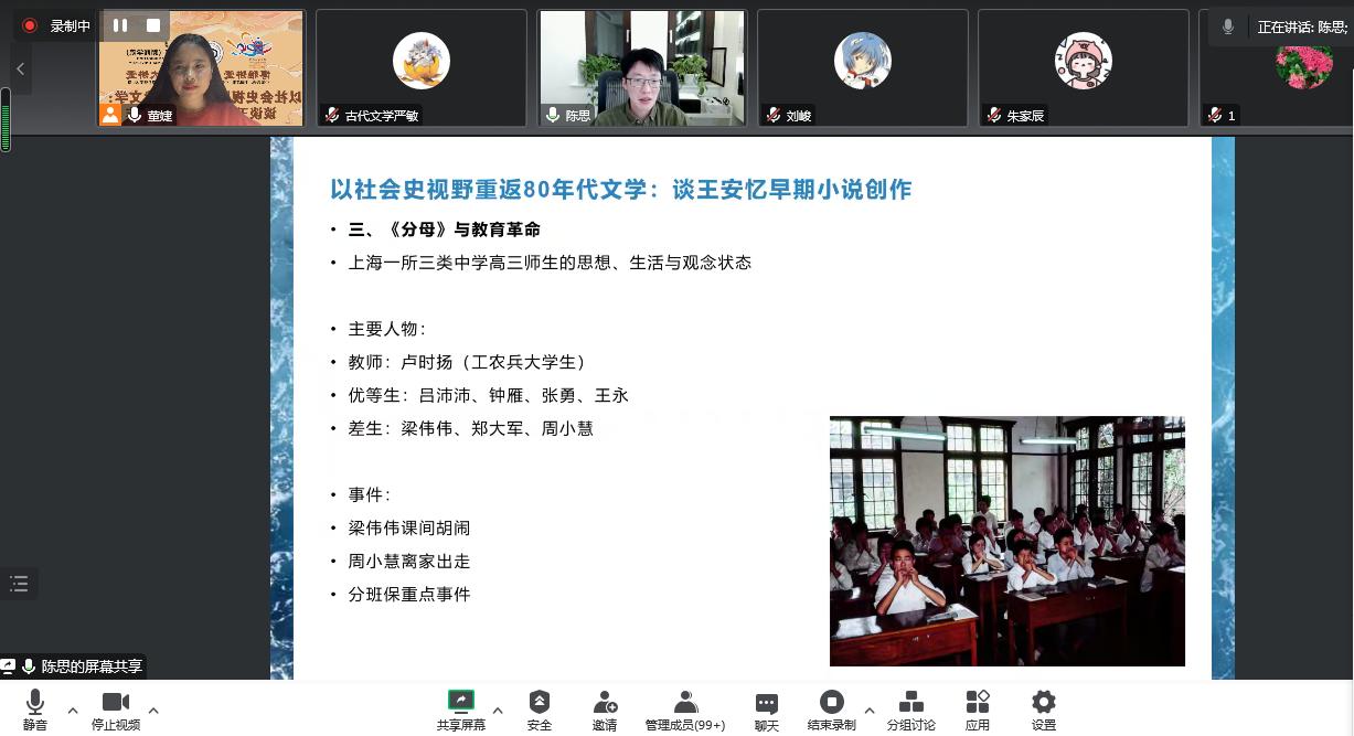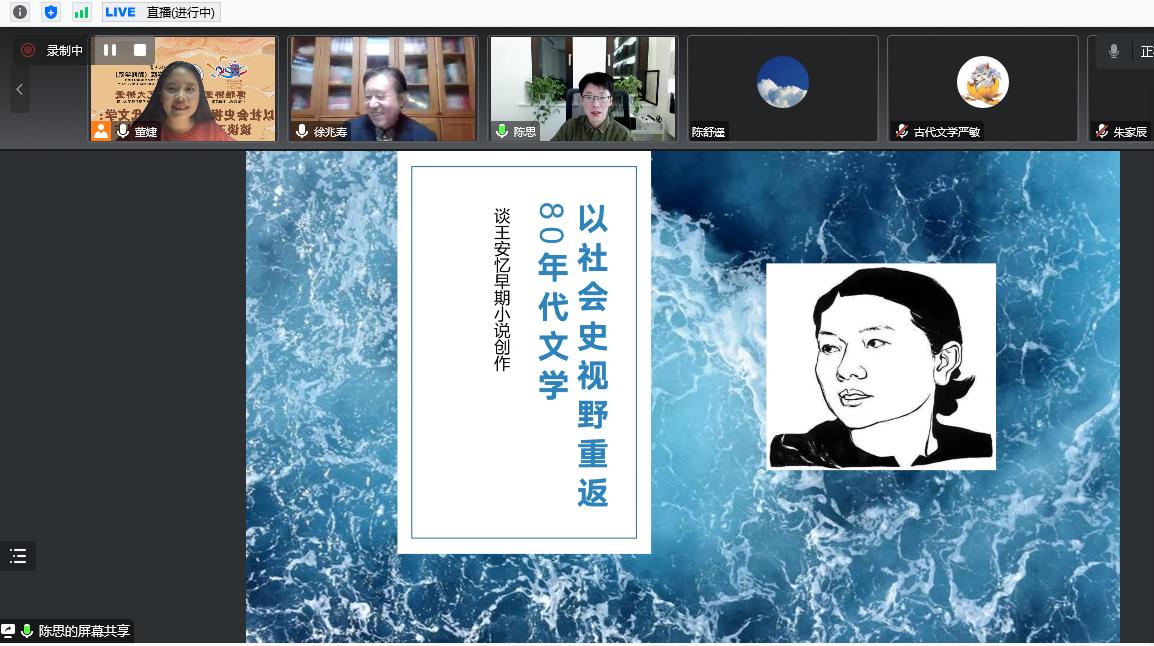 2022年12月8日晚,学院邀请到北京大学文学博士,哈佛大学东亚系访问学者,中国现代文学馆特邀研究员,中国当代文学研究会理事,中国社会科学院文学研究所当代室副研究员陈思,为冰球官网师生在线开展了题为《以社会史视野重返80年代文学:谈谈王安忆早期小说创作》的学术讲座。会议由MG冰球突破官网网站董婕博士主持,徐兆寿院长在开讲前做了欢迎致辞,并说明了“中国话语、中国叙事、中国形象、中国美学——中国当代文学名家系列学术讲座”的举办初衷和意义。本场学术讲座同时对外全程直播,受益师生和直播间听众达到了近6000人,取得了良好的学术效应和积极的社会传播效应,为学术讲座的传播开创了非常良好的范例。