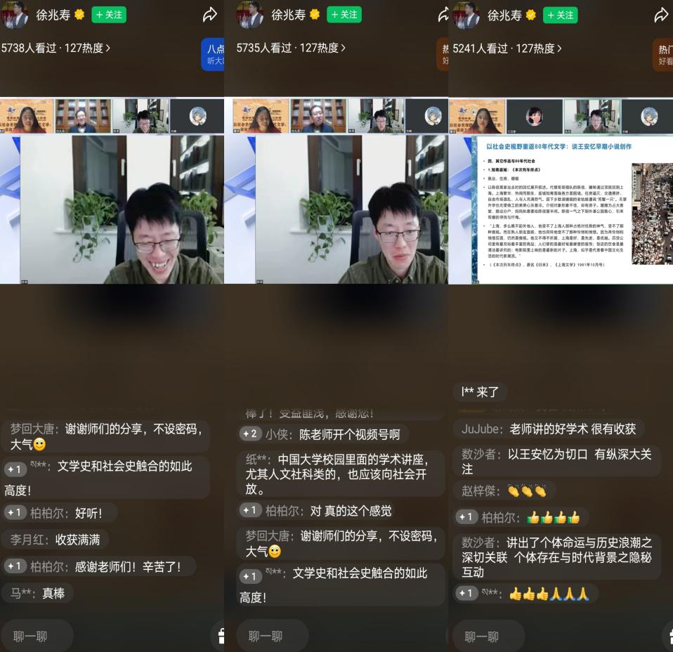 讲座结束后,董婕老师做了总结和点评。她指出,陈思的整场讲座紧贴着文学文本和历史文献,做到了文学研究与社会史视野的高度融合,不仅为听众勾勒了一个有别于文学史的、立体的、多维的、客观的“80年代”,显示了深厚的研究功底,同时展示了人文学者特有的担当和情怀,把历史和当下深深地勾连了起来。也在一定意义上回答了“文学何为”这一恒久又常新的命题。正如直播间的网友评论的那样,“以王安忆为切口,有纵深大关注”。徐兆寿院长在结束辞中指出,“陈思重启了一个80年代,一个理性的80年代”。陈思和同学们互动交流之后,整场讲座在热烈高涨的氛围中结束。