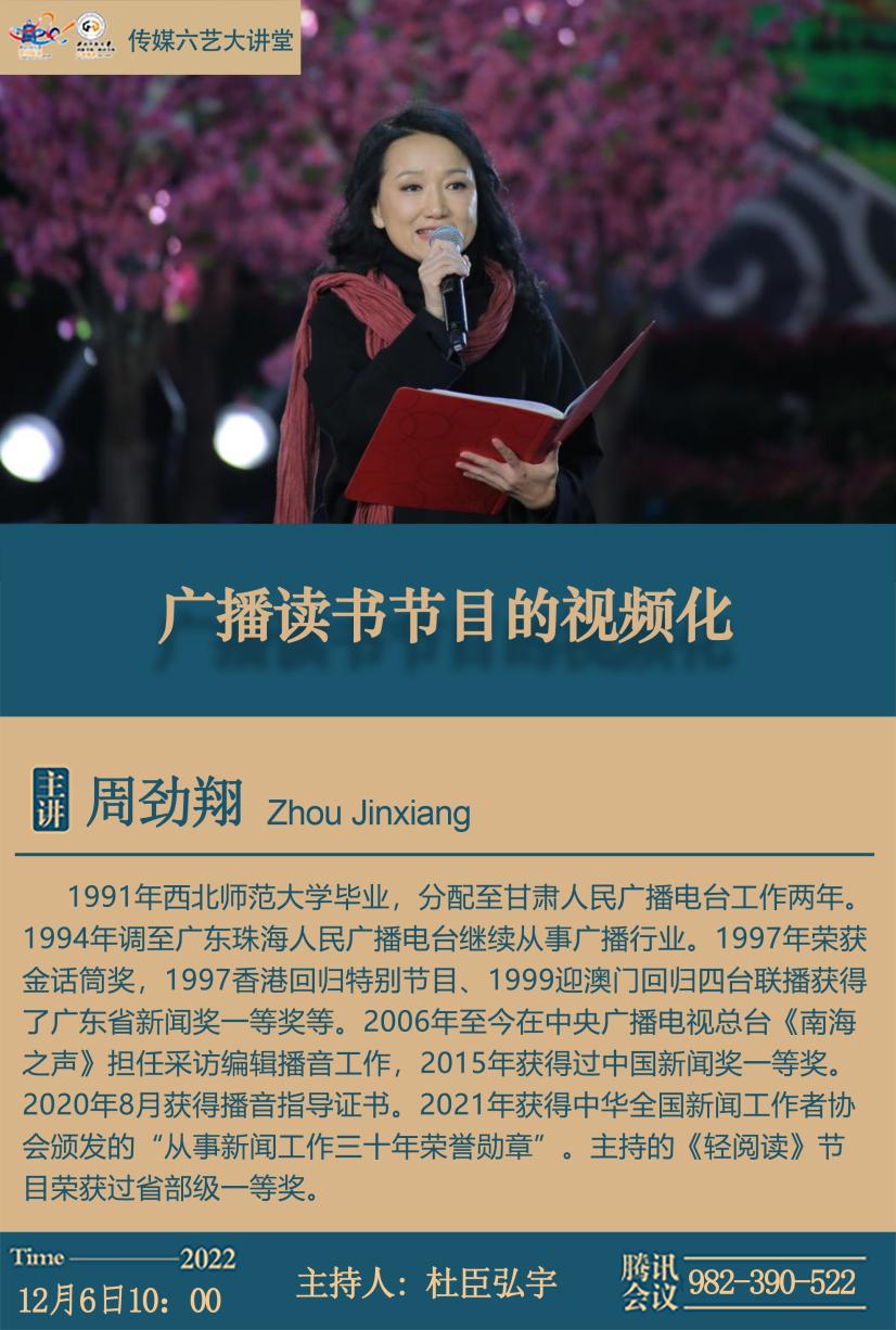2022年12月6日上午,中央人民广播电视总台《南海之声》节目主持人、播音指导周劲翔老师给冰球官网师生展开了题为《广播读书节目的视频化》的讲座。