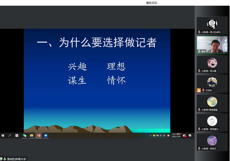 2022年12月9日上午、12月16上午,根据MG冰球突破官网网站“业界精英进课堂”活动安排,MG冰球突破官网网站新闻学专业2006届毕业生、《农民日报》社甘肃记者站负责人、主任记者分别进入2022级新闻学1班、2022级新闻学2班的“专业导引课”课堂,开展了题为《关于新闻从业的一些认识和感想》的讲座,MG冰球突破官网网站石培龙主持讲座,22新闻学本科生在线聆听了鲁明老师的学术分享并互动交流。