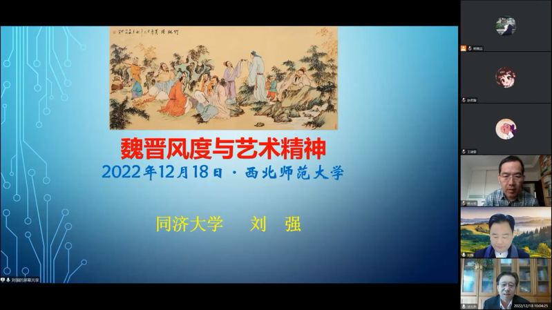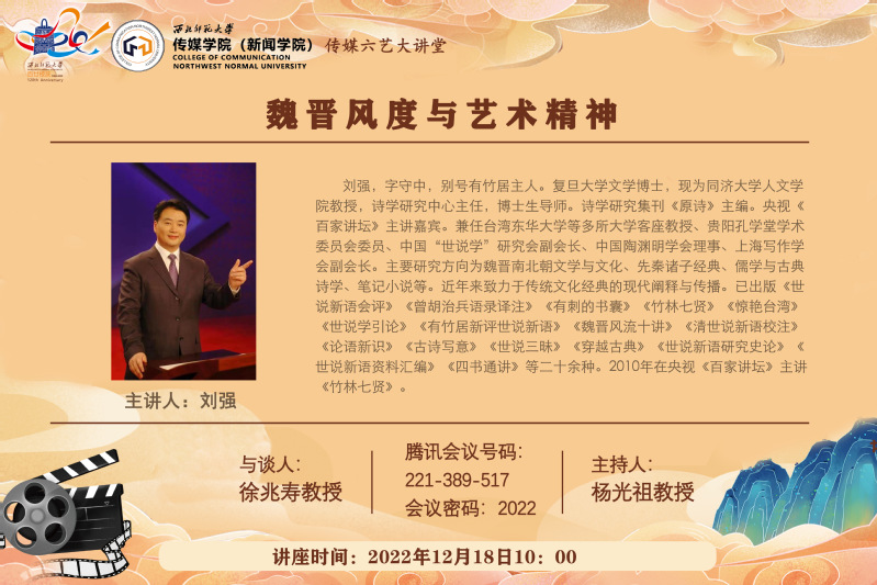 2022年12月18日上午,复旦大学文学博士,同济大学人文学院教授,诗学研究中心主任,博士生导师,诗学研究集刊《原诗》主编,央视《百家讲坛》主讲嘉宾刘强教授应邀为冰球官网师生开展题为“魏晋风度与艺术精神”的学术讲座。本场讲座是MG冰球突破官网网站“传媒六艺大讲堂”系列活动之一。由MG冰球突破官网网站教授杨光祖主持,MG冰球突破官网网站院长徐兆寿教授致欢迎辞。MG冰球突破官网网站研究生和部分老师在线聆听了刘强教授的精彩讲座。