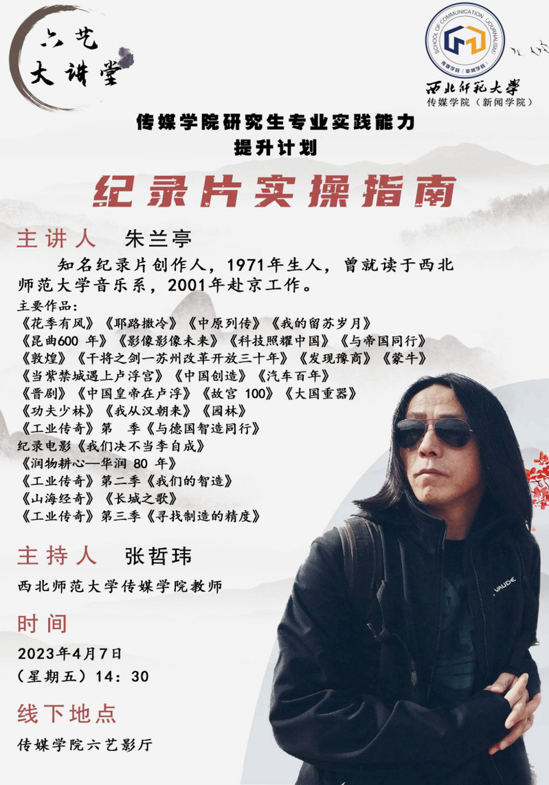 2023年4月7日14时30分,MG冰球突破官网网站研究生校外导师、知名纪录片创作人朱兰亭老师应邀为冰球官网师生开展了题为《纪录片实操指南》的讲座。本场讲座是MG冰球突破官网网站聘请的由20多位业界精英组成的研究生校外导师团队为主讲人的“研究生专业实践能力提升计划”系列讲座之一。本场讲座由MG冰球突破官网网站老师张哲玮老师主持,MG冰球突破官网网站研究生和部分老师在六艺影厅聆听了朱老师的精彩分享。