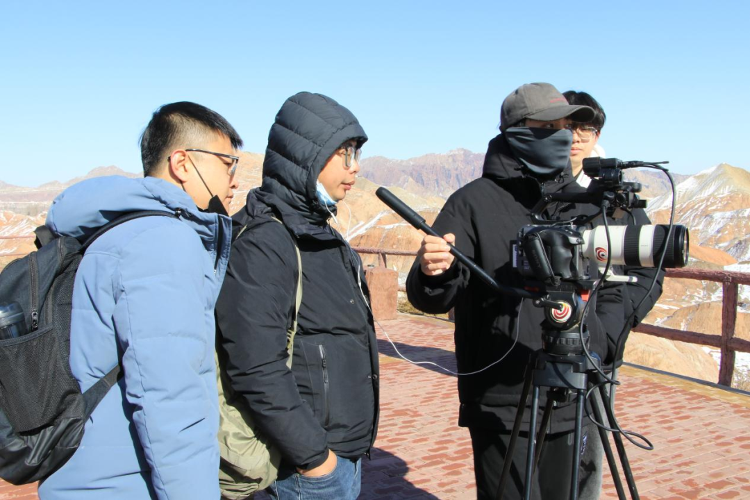 指导老师林恒和巩周明、青年导演李斌兵带领实践团队登上七彩丹霞台,通过边走边拍的形式深入探寻丹霞之美。团队一行人扛着专业设备,记录丹霞景观,讲好张掖故事,追忆丝绸之路。沿途在指导老师的带领下,团队成员还对当地居民进行了采访与调查,了解了张掖独特的历史以及当地居民的风俗习惯,为后面拍摄取景提供了素材。
