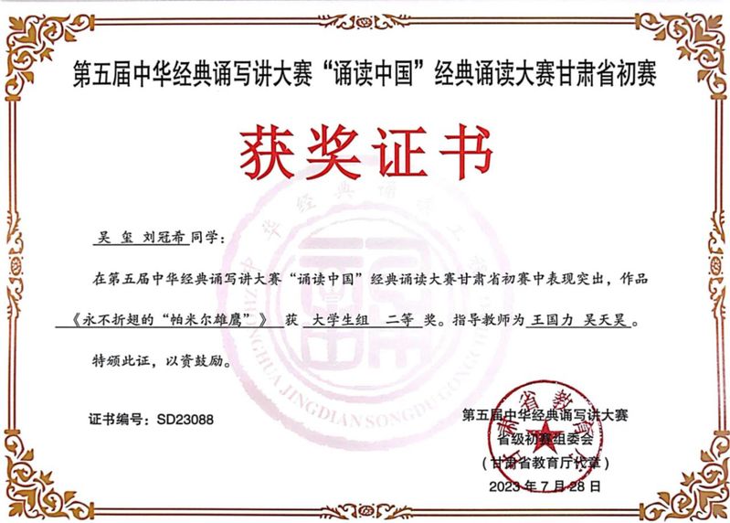 2020级播音与主持艺术1班本科生吴玺和2021级播音与主持艺术1班本科生刘冠希在指导教师王国力、吴天昊的悉心指导下,凭借作品《永不折翅的“帕米尔雄鹰”》在省级初赛中获大学生组二等奖,入围全国决赛并获得大学生组三等奖。