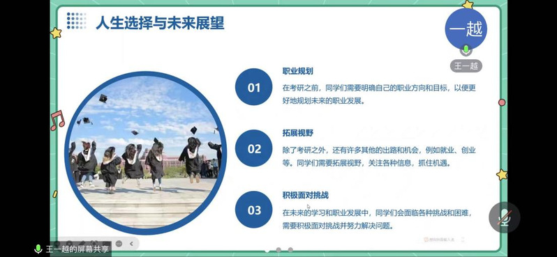 王一越向同学们介绍了“考研报班”与“考研不报班”两种学习方式各自的优缺点,并从英语、政治、专业课三门学科的答题技巧、心态养成、初试和复试的准备几个方面展开经验分享,并向同学们提出关于人生选择和未来展望的建设性建议,干货满满。 会议最后,周艾根据自身考研经历为本次分享会作总结。周艾强调,对于大三、大四的同学,要有明确的复习目标,把握好节奏,科学备考;而大一大二的同学首先要把专业课学好,为考研筑牢扎实的基础。希望同学们在考研路上自律自信,终有所获!