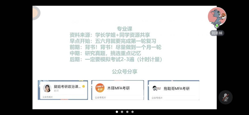 刘易娴分别从备考的时间、地点、资料和教材、课程内容、学习生活、备考期身心健康等几个方面展开经验分享。“好的地方会提高学习效率,答题的效率也是重中之重,要注重答题技巧。同学们一定要坚持,考试时一科没发挥好也一定要坚持考完!黎明之前最黑暗,放弃实在不划算!”娓娓道来的“上岸”经历让同学们备受鼓舞,实用的公众号分享让同学们备受启发。