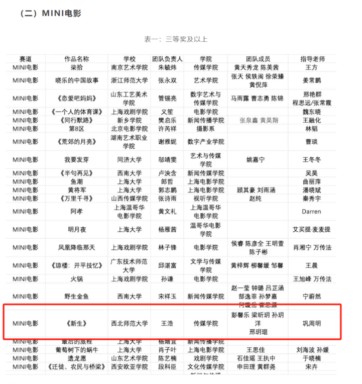 王浩的作品《新生》晋级上海大学生电视节全媒体影像大赛总决赛,进入AI影像赛道,MINI电影赛道三等奖及以上名单!