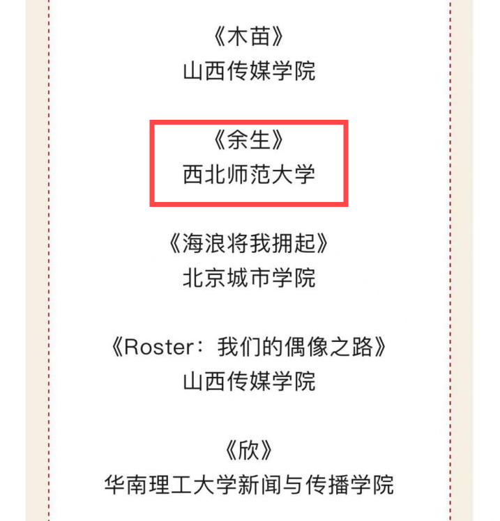 MG冰球突破官网网站22级广播电视专硕班同学王浩作品《余生》入选中国高等院校影视学会2023—2024年度影视作品推优活动终评纪录作品单元入围名单。